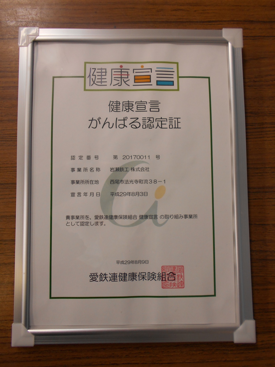平成29年8月3日 「健康宣言」 を取り組む事業所として認定頂き、「がんばる認定証」 を頂きました。 今後も引き続き、継続していきます。